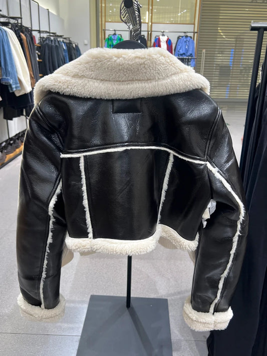 Fitaylor New Autumn Winter Streetwear Thick Warm Moto Biker Coat Women Fashion Loose Lapel Faux Leather Lamb Fur Short Jacket