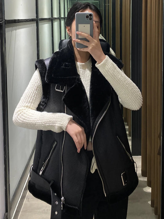 Fitaylor New Autumn Winter Moto Biker Loose Sleeveless Jacket Women Streetwear Lapel Thick Warm Faux Leather Fur Vest with Belt