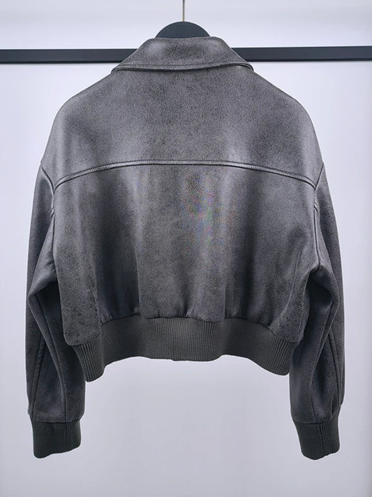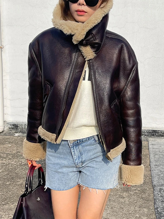 Fitaylor New Autumn Winter Women Vintage Moto Biker Fake Wool Coat Lady Fashion Casual Thick Warm Faux Leather Lamb Fur Jacket