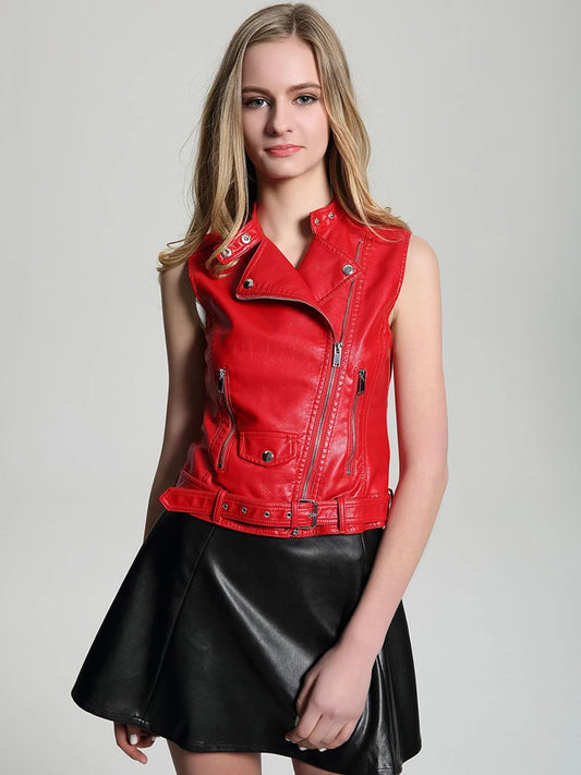 Fitaylor 2022 Spring Faux Red Leather Vest Jacket Women Casual Sleeveless Coat Streetwear Style Sashes Moto Biker Zipper Outwear