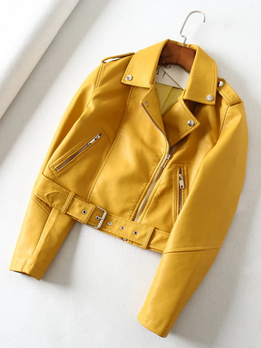 Fitaylor New Spring Autumn Women High Street Turn-down Zipper Faux Leather Jacket with Belt Vintage Moto Biker Short Pu Coat