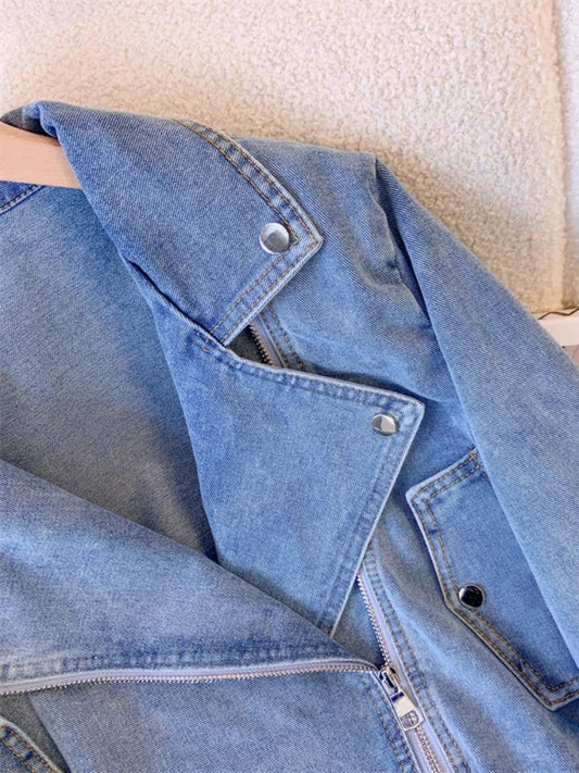 Fitaylor Autumn Winter Women Lapel Zipper Denim Jacket Casual Lady Loose Short Denim Coat Fashion Solid Motorcycle Streetwear