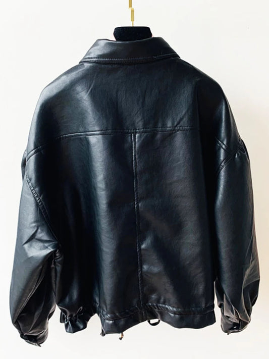Fitaylor Spring Autumn Women Loose Faux Leather Short Jacket Streetwear Female Zipper Moto Biker Retro Rivet Coat Outwear Tops
