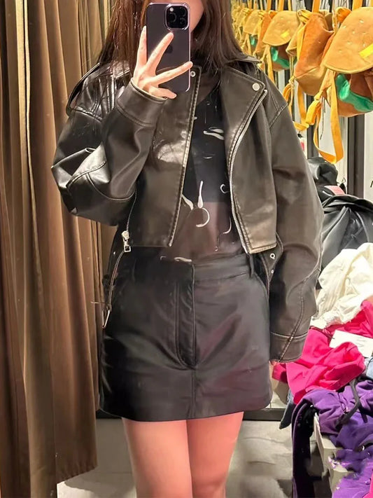 Fitaylor New Spring Autumn Women High Street Faux Leather Short Jacket Lady Vintage Casual Lapel Zipper Motorcycle Pu Coat