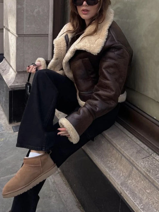 Fitaylor New Autumn Winter Women Vintage Moto Biker Fake Wool Coat Lady Fashion Casual Thick Warm Faux Leather Lamb Fur Jacket